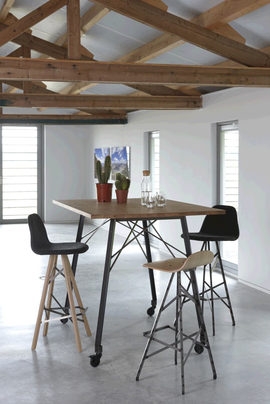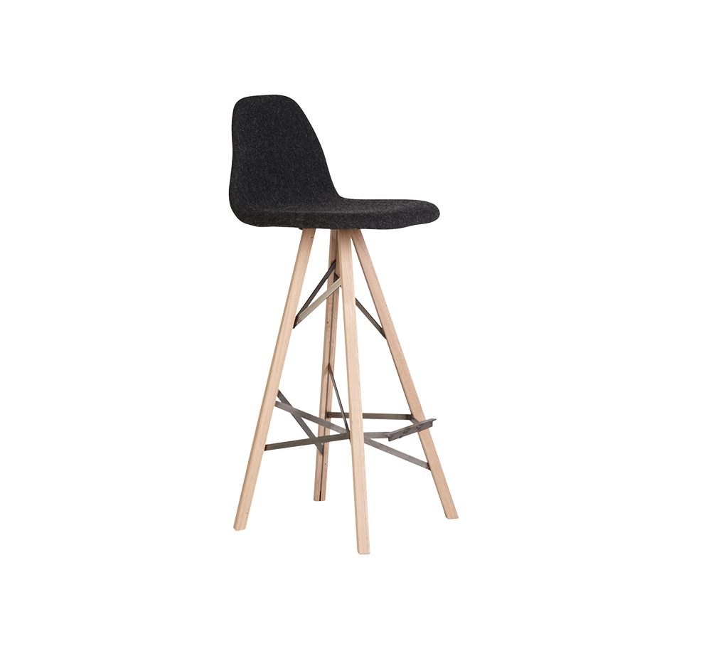 De Piramide barstoel komt in veel variaties. Je kunt deze barstoel helemaal samenstellen zoals je zelf wilt. Dit is de barstoel met een hoge rugleuning en een stoere combinatie tussen het stalen frame en de houten poten.